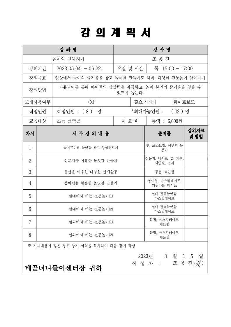 | 강좌명 | 2023년 2분기 평생교육프로그램 - 놀이와 친해지기 | 접수방법 | 온라인 접수(선착순) |