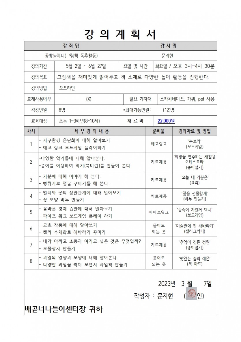 | 강좌명 | 2023년 2분기 평생교육프로그램 - 공방놀이터(그림책 독후활동) | 접수방법 | 온라인 접수(선착순) |