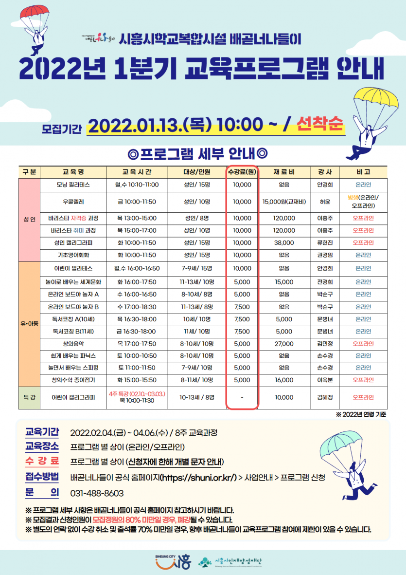 | 강좌명 | 2022년 1분기 교육프로그램 신청 안내 | 접수방법 | 온라인 신청(선착순) |