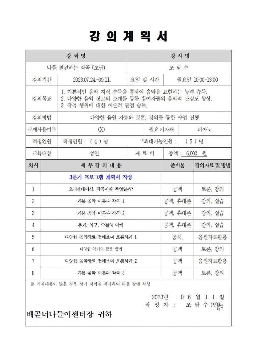 | 강좌명 | 2023년 3분기 평생교육프로그램 - 나를 발견하는 작곡(초급) | 접수방법 | 온라인 접수(선착수) |