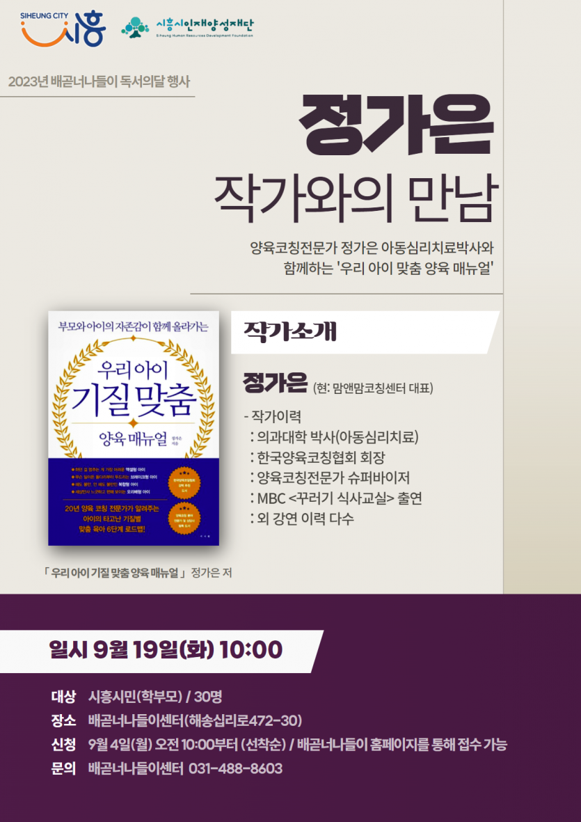 강좌명 독서의달 - 강연(우리 아이 맞춤 양육 매뉴얼) 접수방법 온라인 신청(선착순 접수)