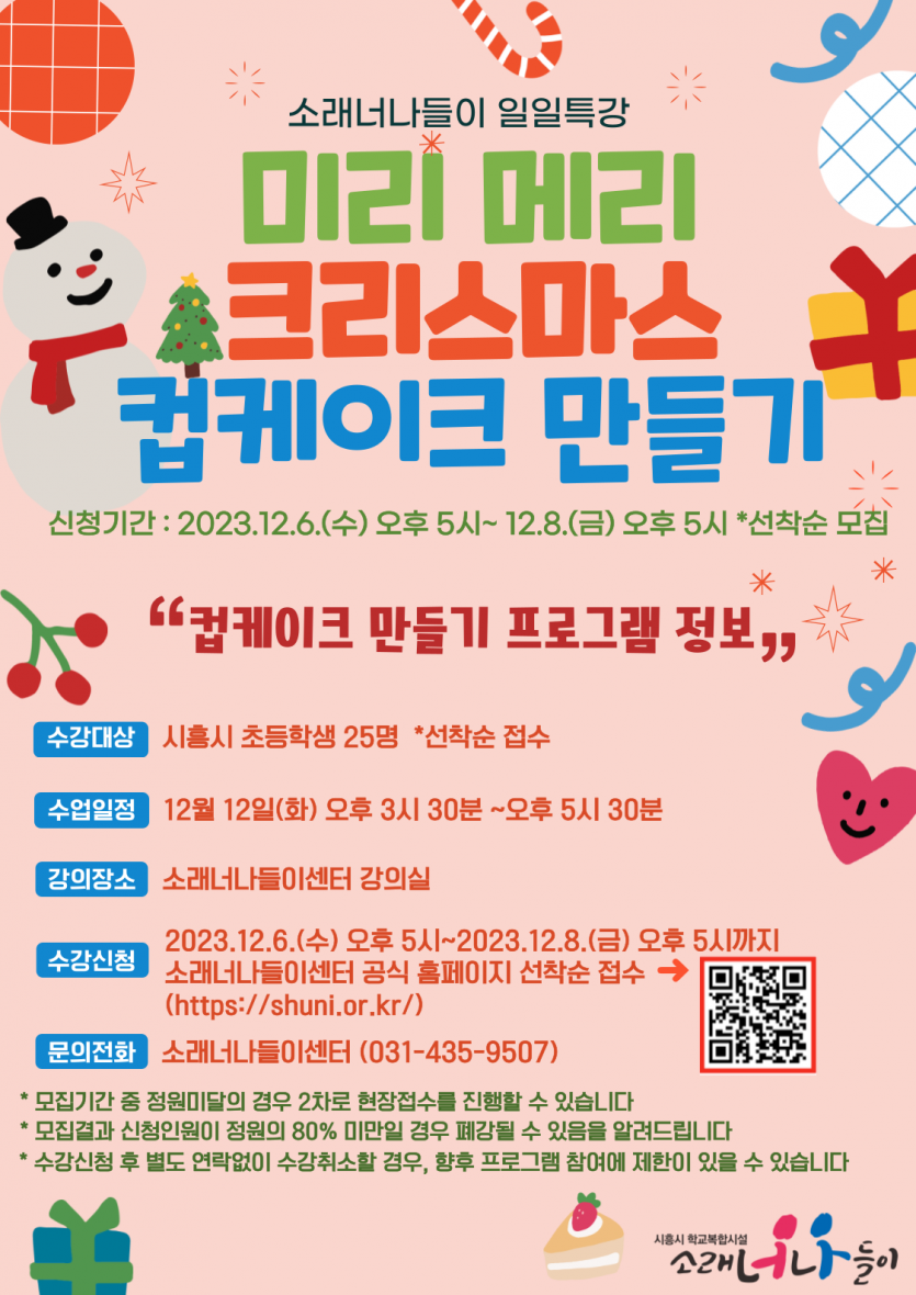 강좌명 일일특강(조리프로그램) '미리 메리크리스마스 : 컵케이크 만들기' 2차모집안내 (초등학생) 접수방법 선착순 접수