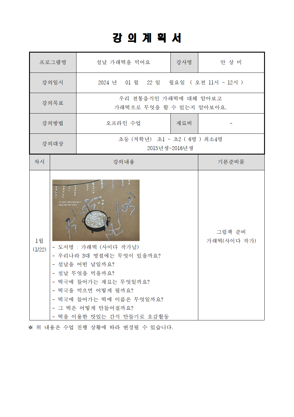 강좌명 겨울방학 프로그램 - 설날 가래떡을 먹어요 접수방법 온라인 접수(선착순)