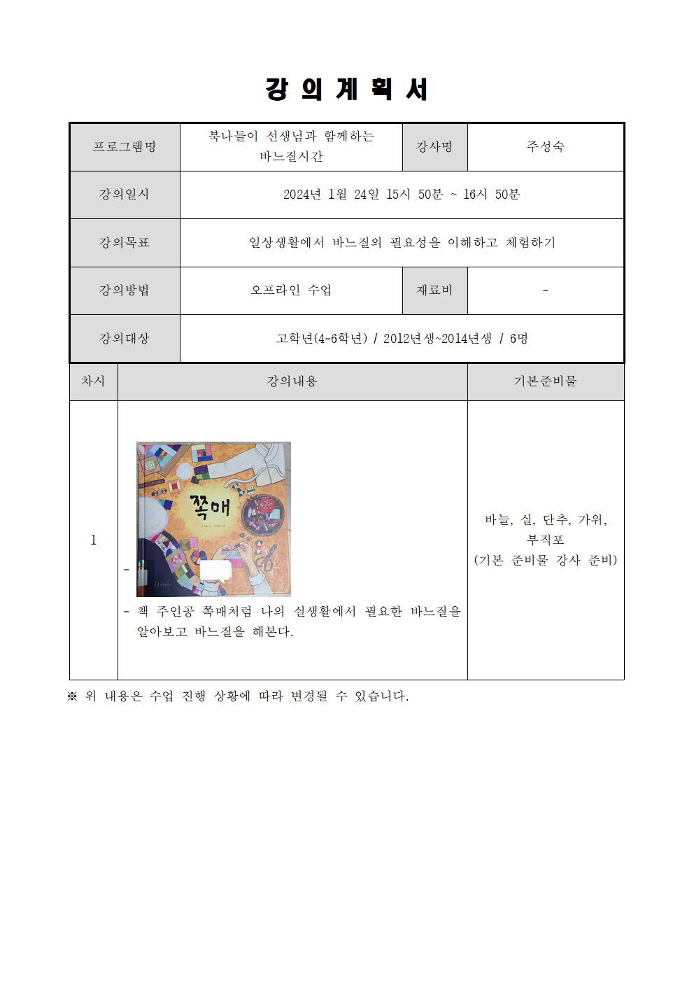 겨울방학 프로그램 - 북나들이 선생님과 함께하는 바느질 시간