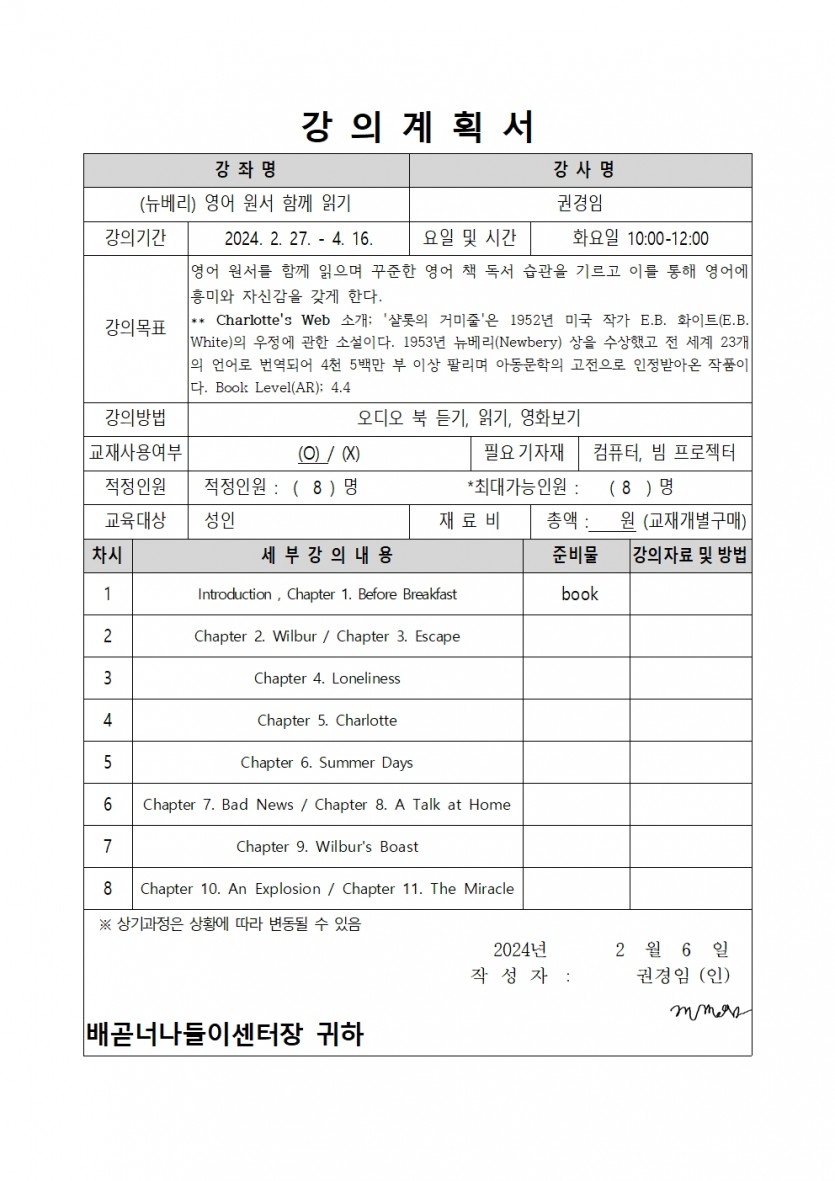 | 강좌명 | 2024년 상반기(1차) 평생교육프로그램 - 영어 원서 함께 읽기 | 접수방법 | 온라인접수(선착순) |