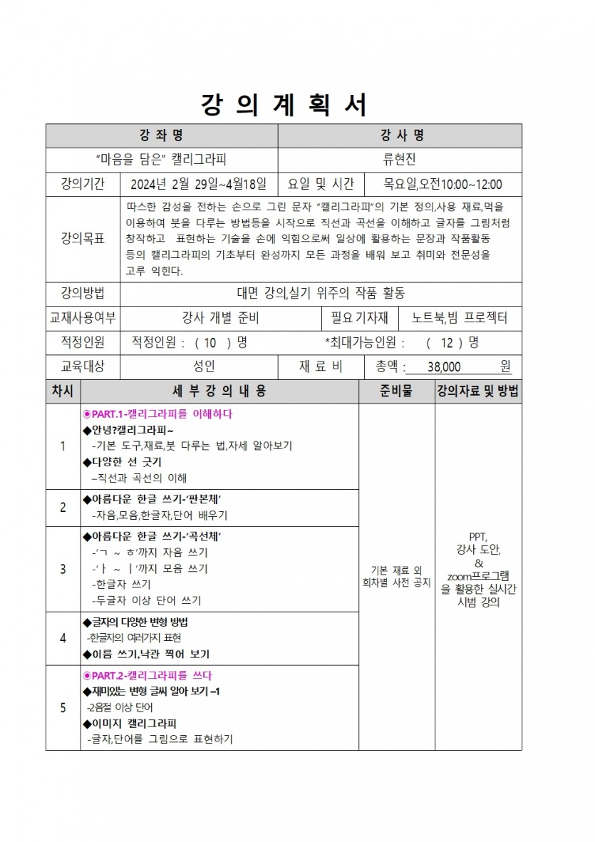 | 강좌명 | 2024년 상반기(1차) 평생교육프로그램 - 마음을 담은 캘리그라피 | 접수방법 | 온라인접수(선착순) |
