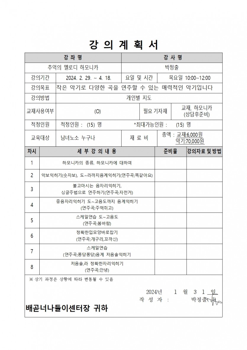 | 수강료 | 10000 | 재료비 | 교재6,000원 / 악기70,000원 |