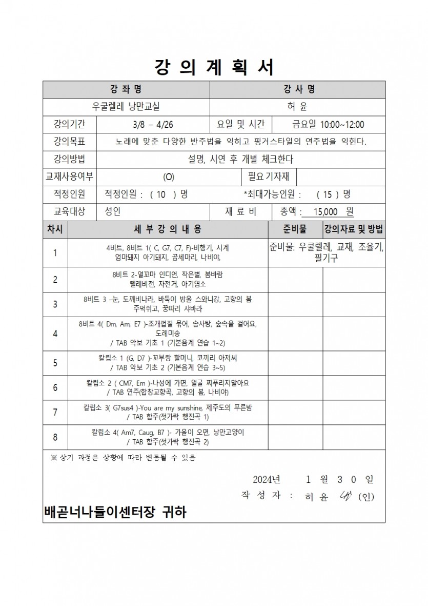 | 강좌명 | 2024년 상반기(1차) 평생교육프로그램 - 우쿨렐레 낭만교실 | 접수방법 | 온라인접수(선착순) |