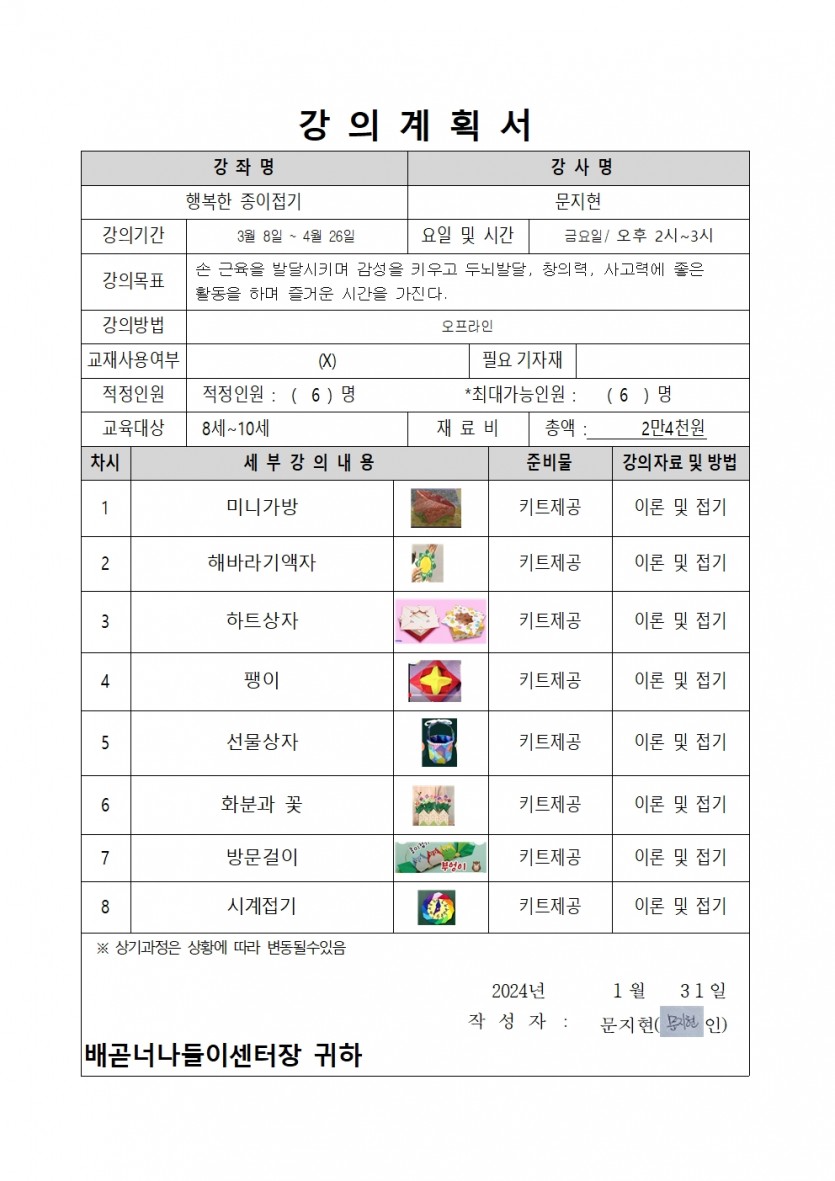 강좌명 2024년 상반기(1차) 평생교육프로그램 - 행복한 종이접기 접수방법 온라인접수(선착순)