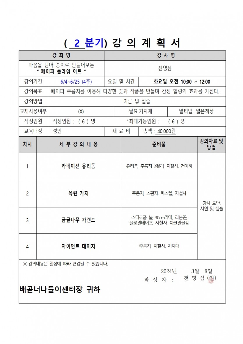 | 강좌명 | 2024년 상반기(2차) 평생교육프로그램 - 페이퍼 플라워 아트 | 접수방법 | 온라인접수(선착순) |