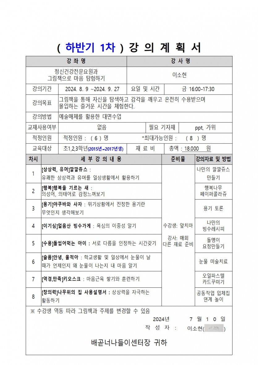 | 강좌명 | 정신건강전문요원과 그림책으로 마음 탐험하기(2024년 하반기 1차 평생교육프로그램) | 접수방법 | 온라인접수(선착순) |