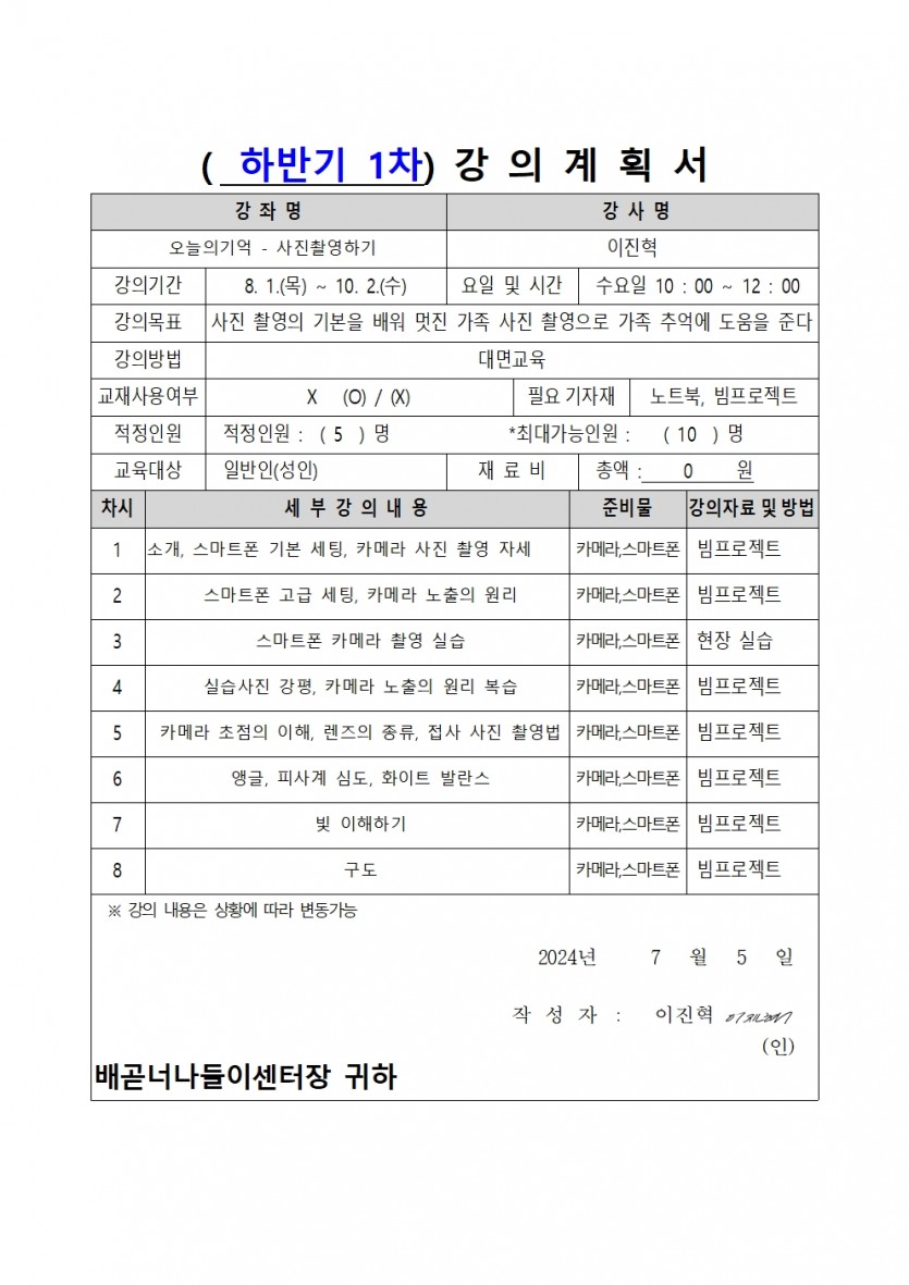| 강좌명 | 오늘의 기억-사진촬영하기(2024년 하반기 1차 평생교육프로그램) | 접수방법 | 온라인접수(선착순) |