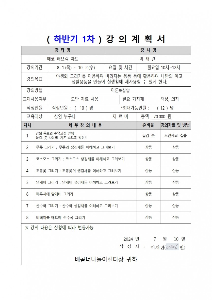 | 강좌명 | 에코 패브릭 아트(2024년 하반기 1차 평생교육프로그램) | 접수방법 | 온라인접수(선착순) |