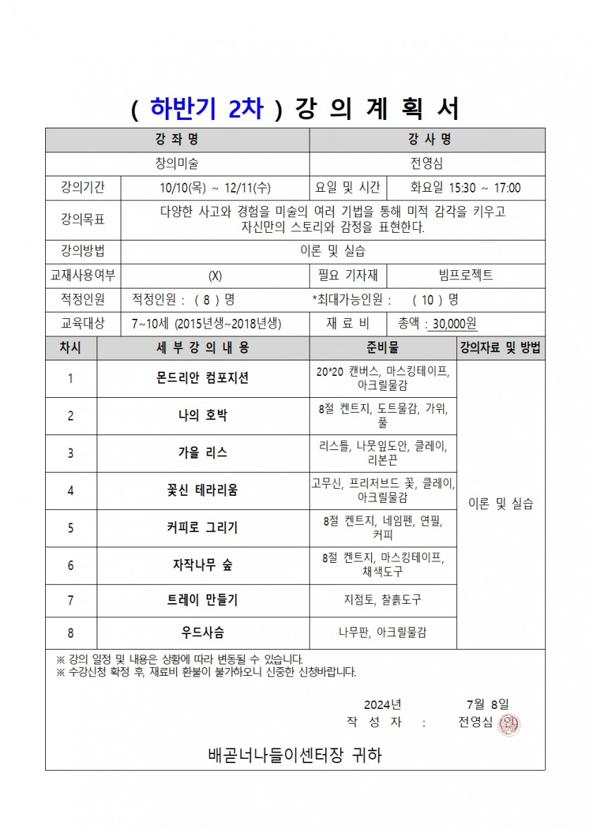 강좌명 창의미술(2024년 하반기 2차 평생교육프로그램) 접수방법 온라인접수(선착순)