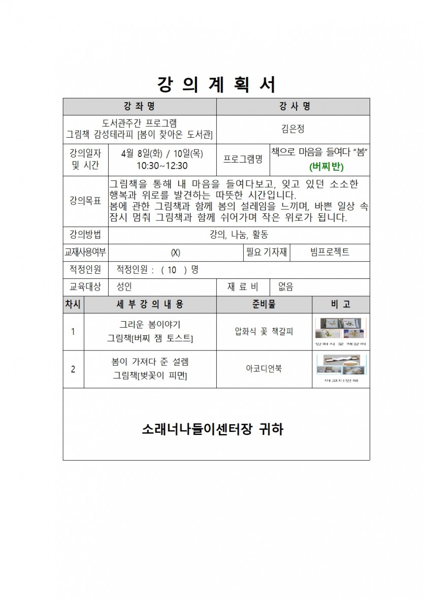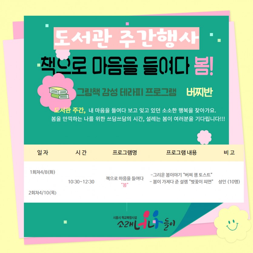 강좌명 ★소래 도서관 주간★ (화,목_성인)「책으로 마음을 들여다 봄!」- 버찌반 접수방법 온라인접수