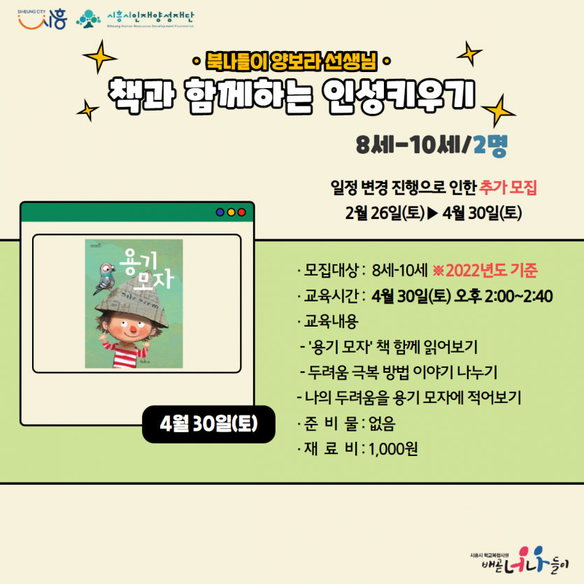 강좌명 4월 작은도서관 토요교실 - 책과 함께하는 인성키우기 접수방법 온라인 신청(선착순)