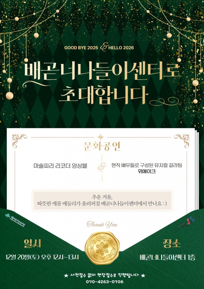 | 강좌명 | (지역맞춤) 미리 메리크리스마스 문화공연 | 접수방법 | 현장접수 |