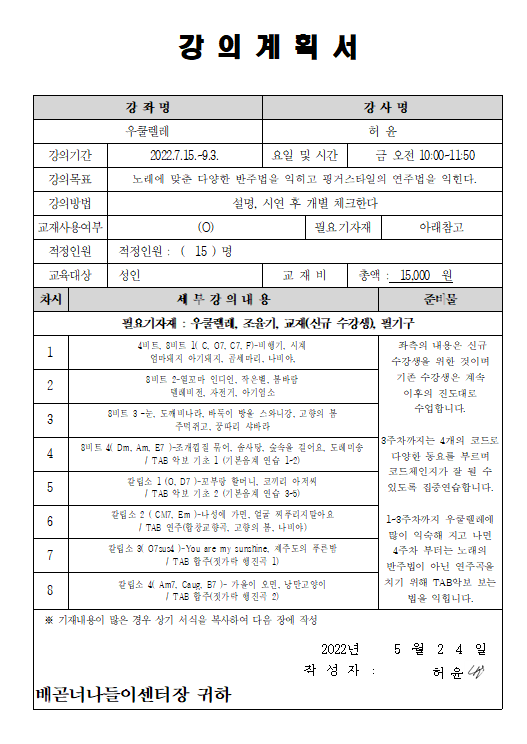 수강료 10,000 재료비 교재비 15,000원 / 우쿨렐레 개별준비