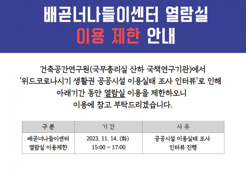 [공지] 배곧너나들이센터 열람실 이용제한 안내(11/14)