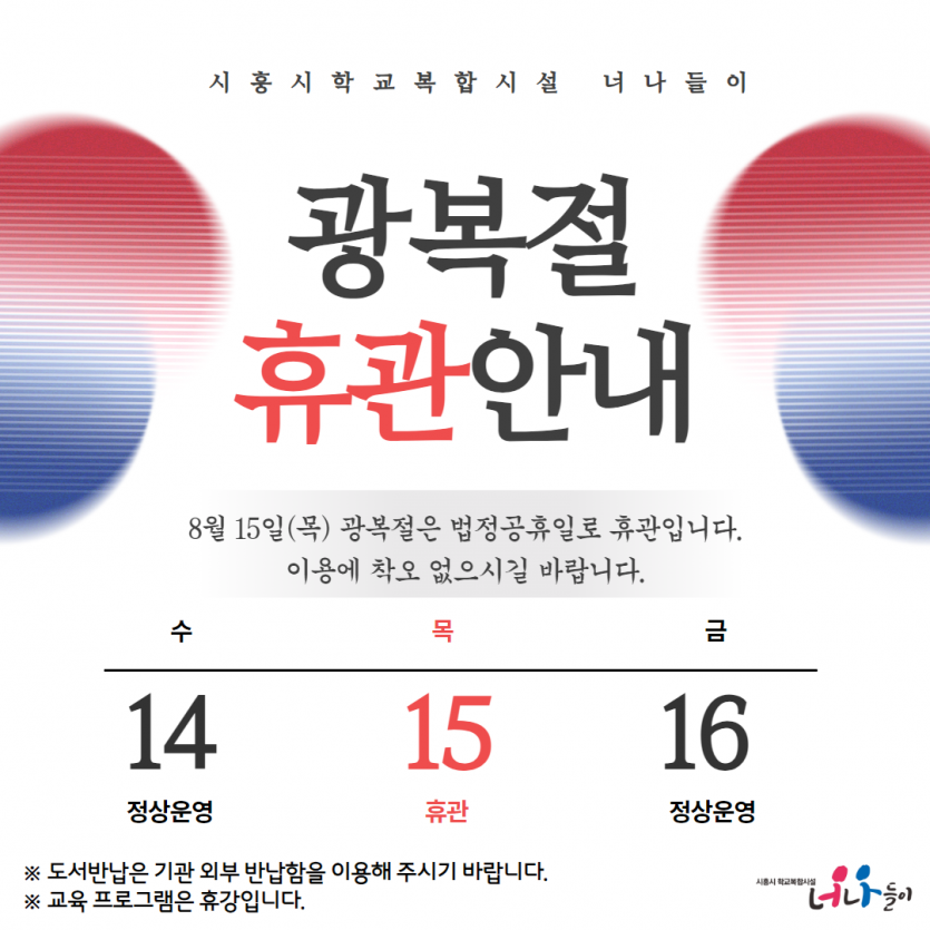 [안내] 시흥시학교복합시설 너나들이 광복절(8/15) 휴관 안내