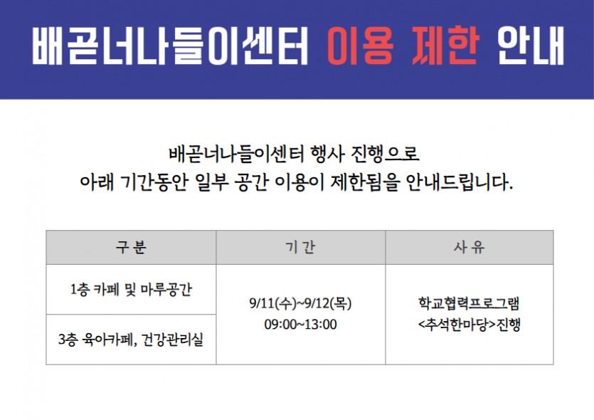 [공지] 배곧너나들이센터 이용제한 안내(9/11~9/12)