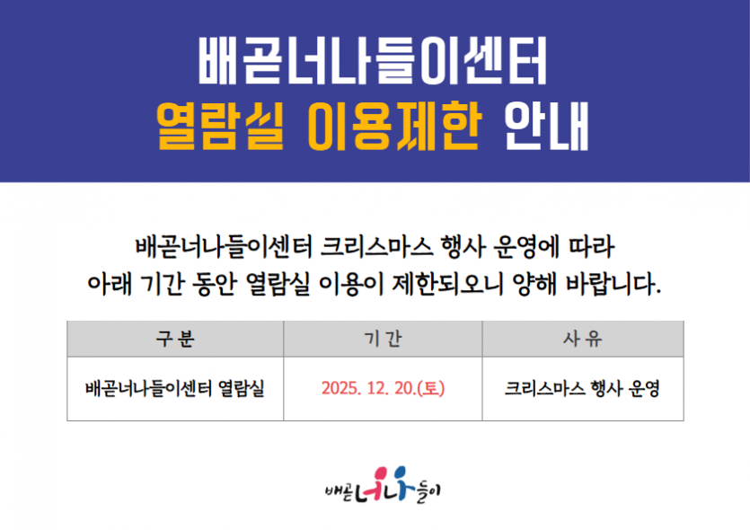 [공지] 배곧너나들이센터 열람실 이용제한 안내(12/20)