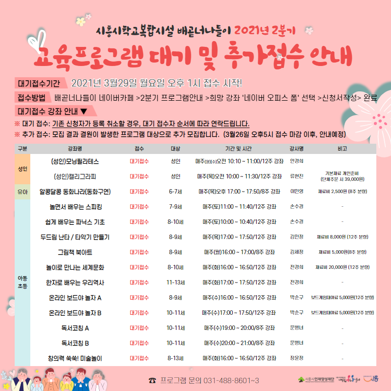 배곧너나들이 2021년도 2분기 교육/문화/독서프로그램 안내 (접수기간 : 2021. 03. 24.(수) 선착순 접수)