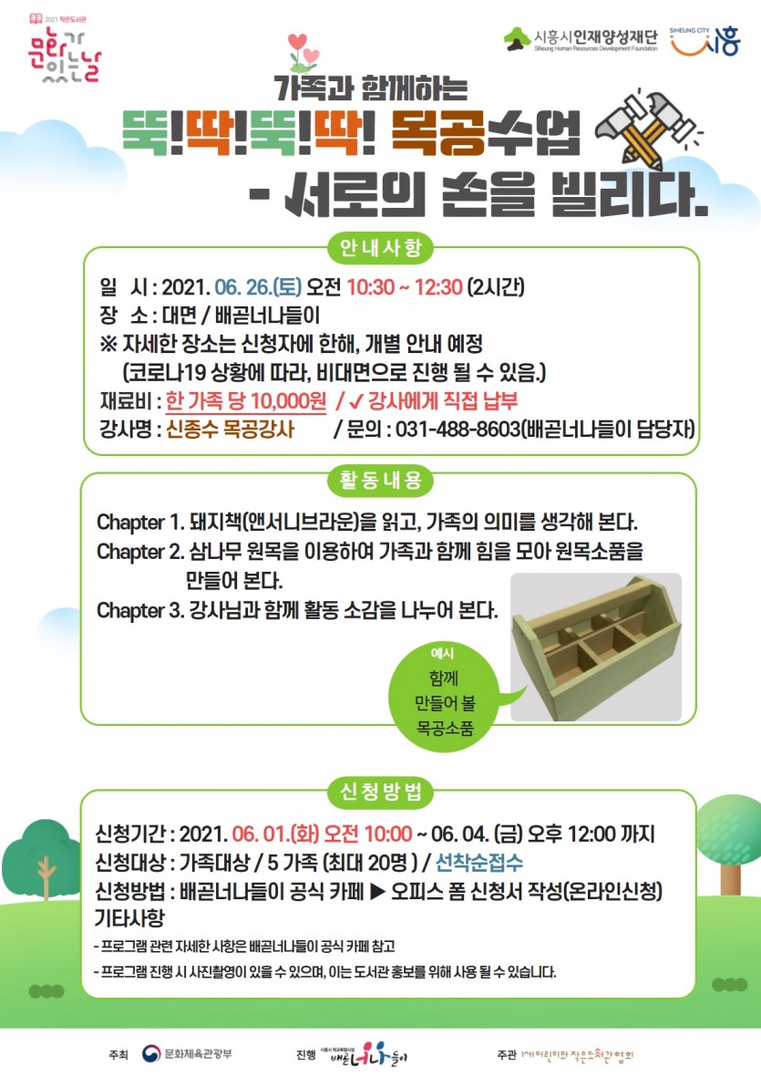 [안내] (문체부) 2021 작은도서관 '문화가 있는 날' 세 번째, 뚝!딱!뚝!딱! 목공수업 안내