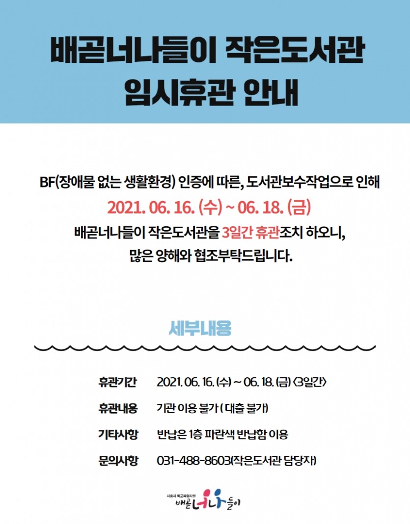 [공지] 배곧너나들이 작은도서관 임시휴관 알림