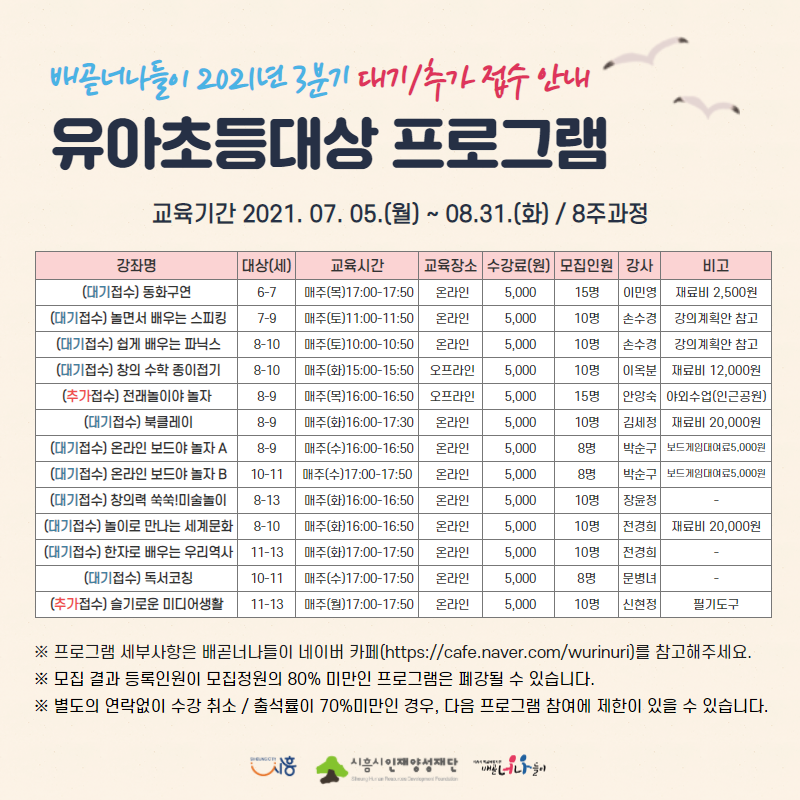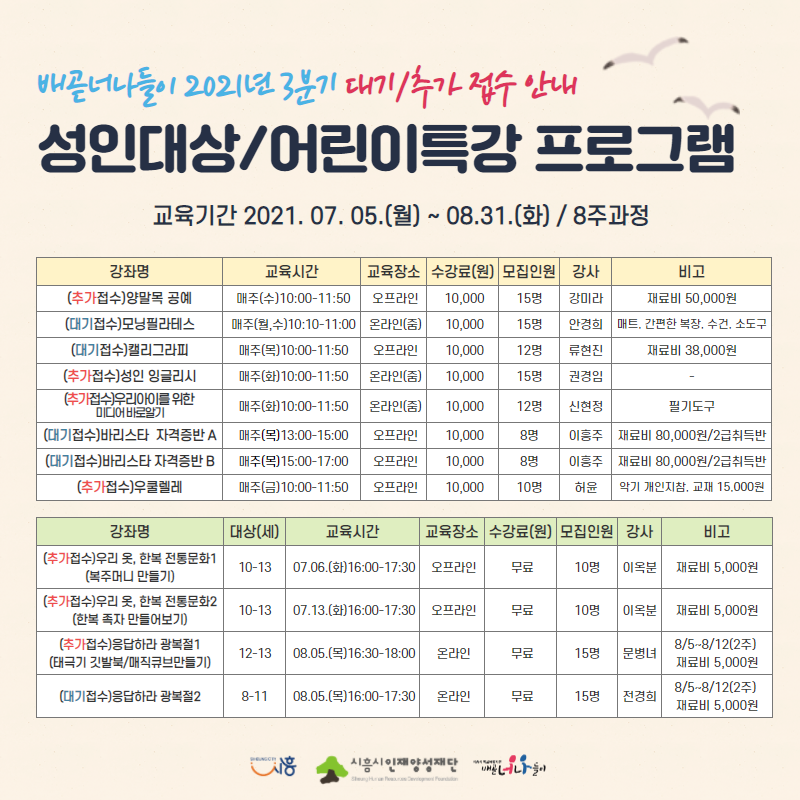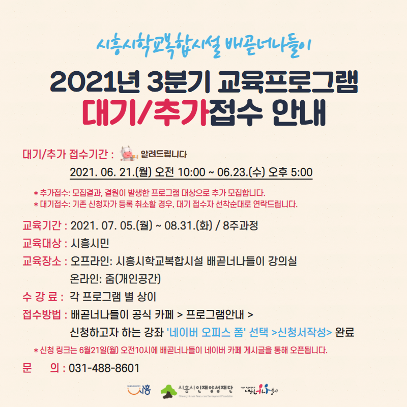[안내] 2021년 3분기 교육프로그램 대기/추가 접수 일정 안내