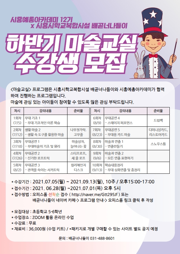 [초등5-6학년 대상] 제12기 시흥예총 아카데미 <하반기 마술교실> 수강생 모집 접수기간 : ~7월 1일 오후 5시까지 자세한 내용은 네이버 카페 참조 부탁드립니다. https://cafe.naver.com/wurinuri/333