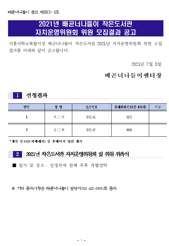[안내] 2021 배곧너나들이 작은도서관 자치운영위원 모집 결과공고