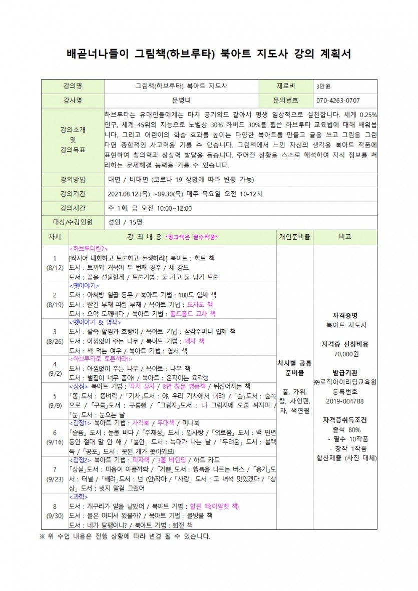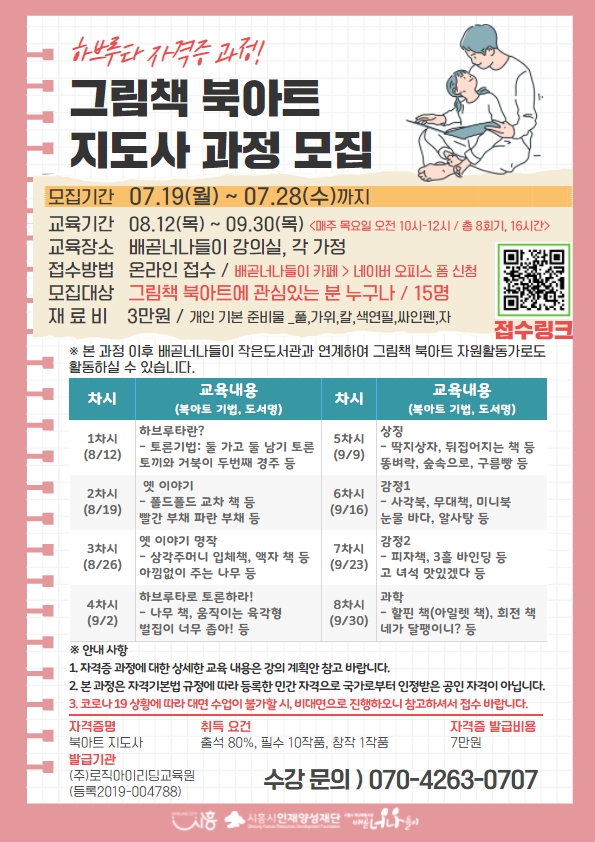 본 과정을 수강하신 후 배곧너나들이 작은도서관과 연계하여 그림책 북아트 자원활동가로 활동하실 수 있습니다.