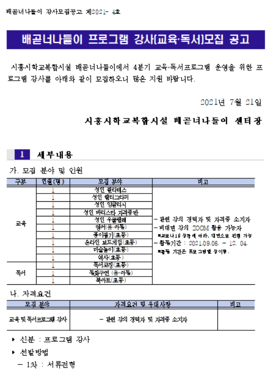 [공지] 배곧너나들이 4분기 프로그램(교육·독서프로그램) 강사 모집