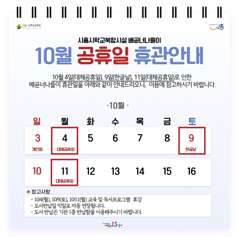 [공지] 배곧너나들이 10월 공휴일 휴관안내