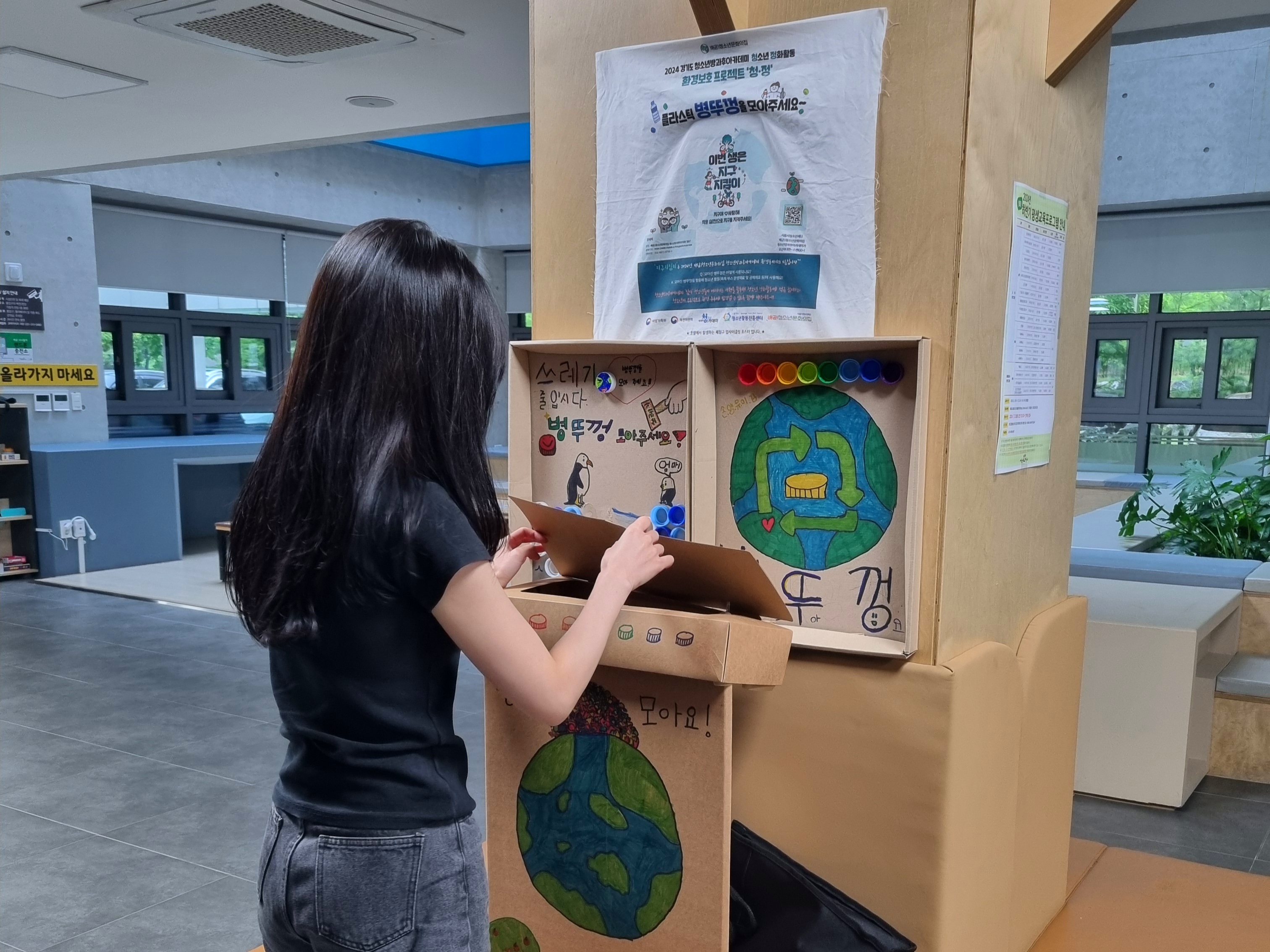 2024년 배곧1청소년문화의집 청소년방과후아카데미 ‘빛다’ 청소년들의 [청소년 정화활동] 공동챌린지로 배곧너나들이센터 내 병뚜껑 수거함 설치하여 진행되고 있습니다.
