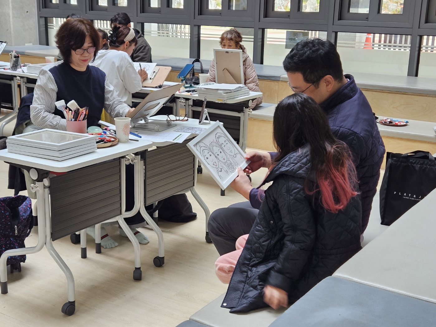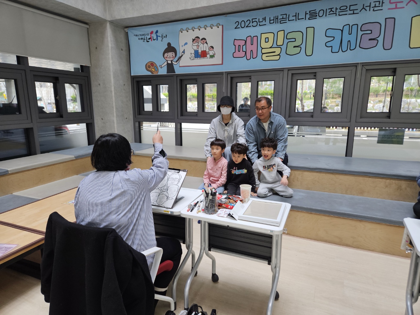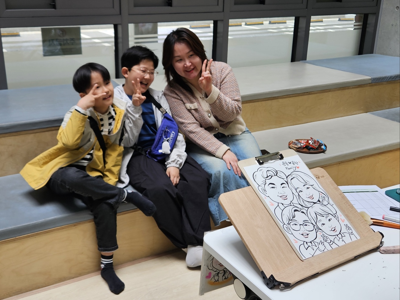 가족 캐리커쳐를 위해 아빠, 엄마, 아이들 온 가족이 총출동했어요!