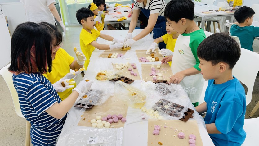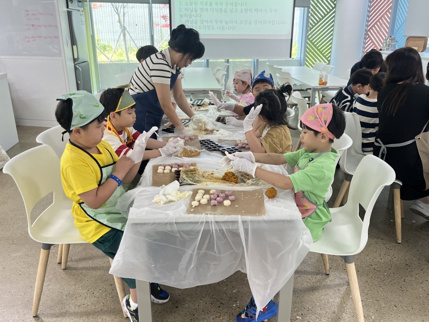 예쁘고 앙증맞은 다식이 하나둘 피어날 때마다 “우와~ 예쁘다!”, “꽃을 닮았어요!”라는 사랑스러운 목소리가 조리실을 가득 채웠어요.
