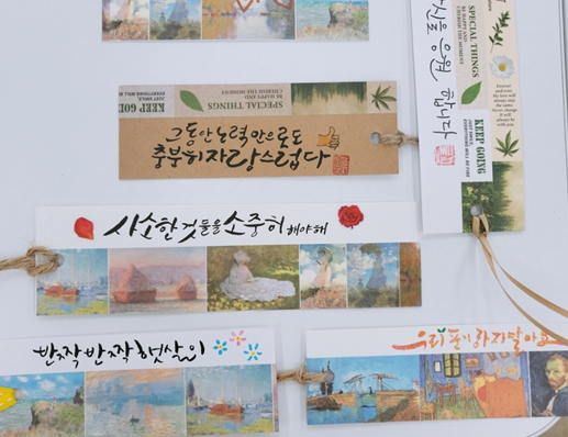 또한 캘리그라피 교육프로그램 수강생으로 구성되어, 나만의 작품활동을 전개하는 [캘리캐리]와 오란다 만들기, 가죽지갑 공예 등 손재주를 뽐내는 [사부작사부작] 동아리가 있죠.